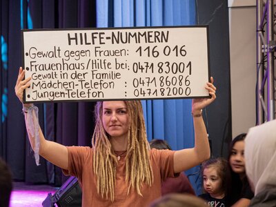 Dass die Veranstaltung wegen des schlechten Wetters kurzfristig vom Leher Pausenhof in die regengeschützten Wände des nahe gelegenen Lehe-Treffs verlegt werden musste, tat der friedlichen und dabei sehr lebendigen Stimmung keinen Abbruch. Im Gegenteil: Menschen aller Geschlechter, Altersstufen, Nationalitäten und Hautfarben waren gekommen.